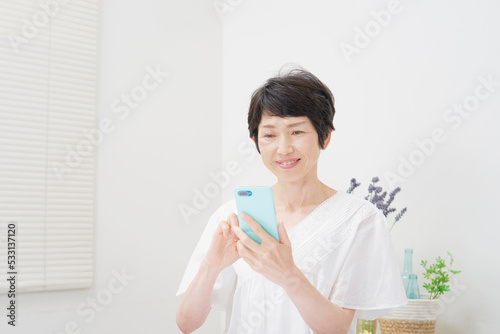 woman, middle-aged, aged, smartphone, spend, home, summer, japanese, smile, touch, smartphone, possess, living room, room, indoor, lifestyle, indoor, asian, 50's, alone, waist up
