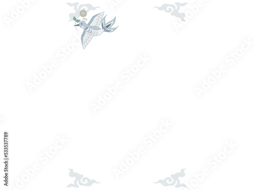 bird, chrysanthemum, flower, leaf, frame, frame, japan, cloud, blue, blue, yellow, green, grey, white, white background, postcard, dimension, copy space, message, card, greeting card, floral, illustration