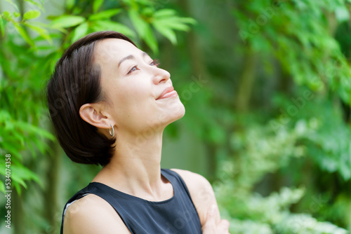 woman, portrait, park, skincare, ultraviolet, tan, sunblock, dress, singlet, homemaker, cosmetic, beauty, face, waist up, sunbath, green, nature, open air, open air, outdoors, beauty, elegant, smile, smile, smile, crop, short hair, shortcut, young, 30s, alone, japanese, asian, chinese