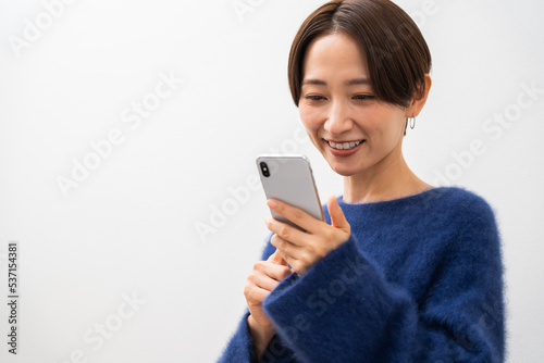 touch, look, winter, woman, smartphone, call, smartphone, casual, indoor, people, japanese, smile, young, 30s, sweet, indoor, mobile phone, waist up, lifestyle, mobile, portrait, pose, light, asian, beauty, clean, pretty, expression, model, reservation, inquiry, speaking, conversation, communication, call center, contact, sarong, coiffure, shortcut, knit