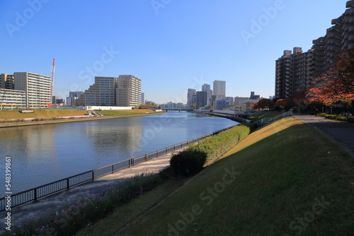 city, architecture, stream, building, urban, city landscape, downtown, water, sky, bridge, waterfront, view, landscape, river, bank, grass, condo, waterfront, blue skies, tokyo, city, immensity, great, promenade, walk