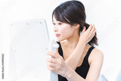 japanese, chinese, hair, coiffure, shampoo, scalp, check, mirror, business, health, asian, woman, black hair, copy space, hair care, preparation, korean, cosmetic, radiancy