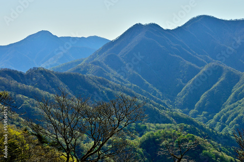 丹沢の水晶沢ノ頭 新緑頃 丹沢主稜の山々を望む 丹沢 甲相国境尾根 水晶沢ノ頭より左から蛭ヶ岳、鬼ヶ岩ノ頭(鬼ヶ岩)、不動ノ峰、大笄、熊笹ノ峰、檜洞丸