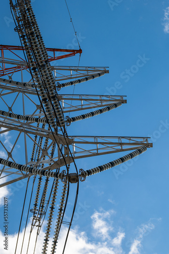 electricity, blue skies, energy, high voltage, electronic, power, power, powerline, sky, wire, tower, landscape, sunny, tower, japan, building, construction, white, deal, dangerous, live, building, truss, electric, power generation, blackout, electromagnetic, infrastructure, brownout, send, industry, environment, facility, ecological