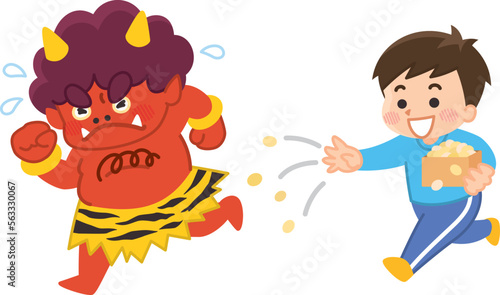 節分の豆まき 豆を撒く男の子 逃げる赤鬼