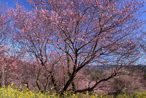 cherry blossom, flower, pink, pink, yellow, mountain, sky, blue skies, nature, landscape, lovely, sweet, clean, bloom, flower petals, view, open air, leisure, rest, refresh, hanami, background, early spring, spring, four seasons, season, tour tourism, travel, journey, shikoku, japan
