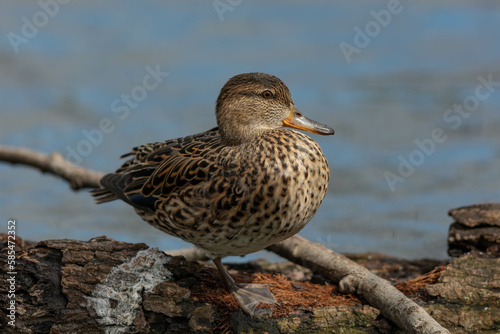 倒木に片足で立つ雌のコガモ
