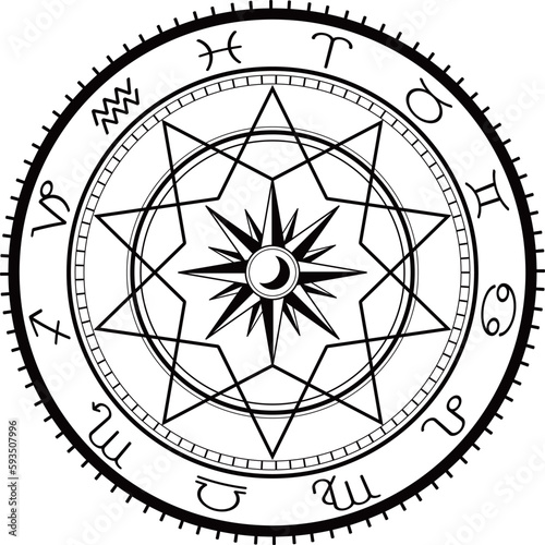 zodiac, compass, vector, magic, animation, game, vintage, spiritual, astrology, astronomy, signs, round, design, illustration, device, art, background, aged, gesture, character, monochrome, monotone, black, line, black-and-white, yen, fortune-telling, fantasy, black magic, invocation, magician, religion, magic, graphic, concept, visual, icon