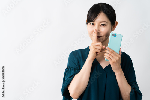portrait, people, person, woman, woman, japanese, japan, young, 30s, smartphone, mobile, mobile phone, stand, positive, secret, mouth, hand, gossip, surprised, trauma, reveal, communication, surprise, joyful, hr, promotion, success, indoor, indoor, white background, copy space, white, waist, green