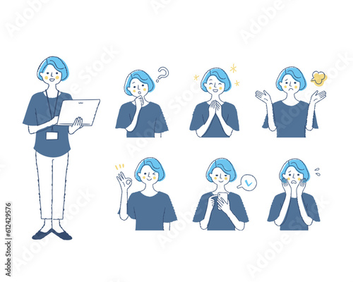 people, illustration, vector, smile, woman, japanese, waist up, expression, variation, set, pose, young, 30s, emotion, smartphone, peace, problem, smartphone, question mark, ok, rejoice, discouraged, gesture, pattern, check, stand, ol, apprehension, negative, work, notebook