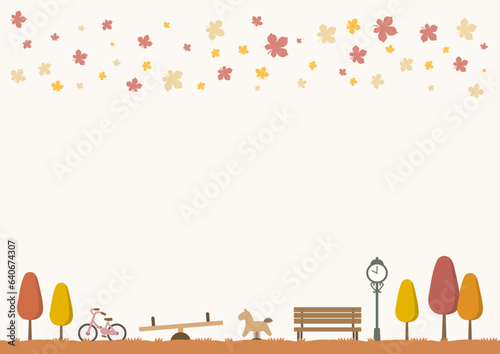 fall, september, october, november, seesaw, rocking horse, bike, park, landscape, view, nature, square, outing, leisure, outdoors, travel, suburban, countryside, grass, wood, plant, watch, copy space, blank space, bench, background, material, season, flat, sweet, pretty, playground, open air, vector, illustration, design