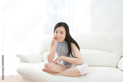 man, woman, asian, family, house, lyric, laugh, smile, leisure, relaxation, drape, couch, leggings, happy