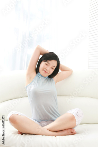 man, woman, asian, family, house, lyric, laugh, smile, leisure, relaxation, drape, couch, leggings, happy