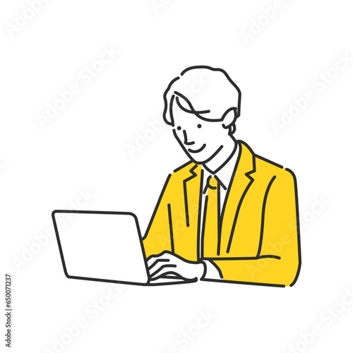 man, illustration, people, businessman, personal computer, notebook, personal computer, screen, concentration, remote, online, meeting, meeting, remote, working, work, business, office, employee, newcomer, staff, presentation, information, smile, contemplate, idea, flash, young, waist up, 30s, japanese, illustration, vector