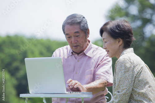 japanese, man, 60's, woman, aged, couple, wife, husband, lively, chum, cuddle, aged, grandfather, babushka, family, fun, health, young, relax, seated, speaking, conversation, personal computer, waist up, up, aged, open air, people, two people, forest, verdure, green, park, garden, green, gardening, chair, table, vivid, grass, personal computer