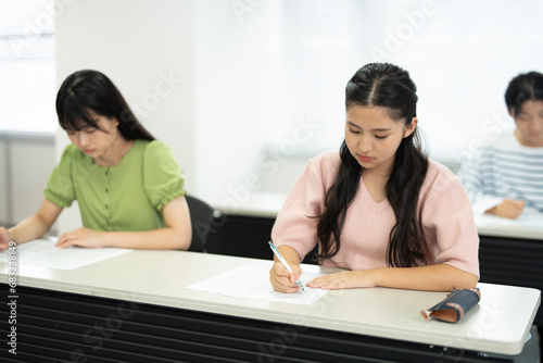 training, learning, indoor, person, asia, japanese, teenage, youth, man, lovely, sweet, good-looking, student, junior, girl, class, lesson, schooling, study, classmate, homework, note, posting, pen, table