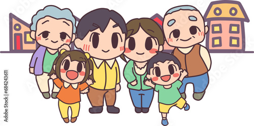 頭身低めにかわいくデフォルメした家族三世代の家族写真風カラーイラストセット