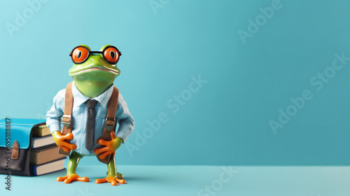 シャツにネクタイをつけて新学期に挑む眼鏡をかけた緑色のアマガエルの学生、背景水色で本がたくさん詰まった鞄がある、コピースペース有