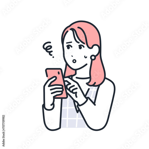 contemplate, woman, smartphone, smartphone, problem, difficulty, apprehension, unrest, expression, vector, negative, charge, plan, revision, casual, people, illustration, lifestyle, waist up, japanese, young, cyberspace, reservation, chat, contact, consultation, online, mobile phone, mobile, call, trouble, operation