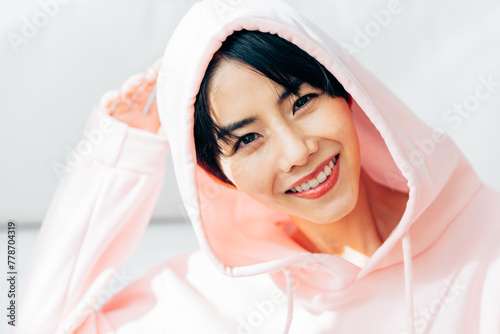 portrait, woman, smile, casual, beauty, beauty, hoodie, natural, lifestyle, health, cosmetic, light, japanese, people, young, missy, indoor, indoor, copy space, smile, diet, sweet, relax, hand, skin, shadow, pretty, skincare, face, asian, waist up, room, smile
