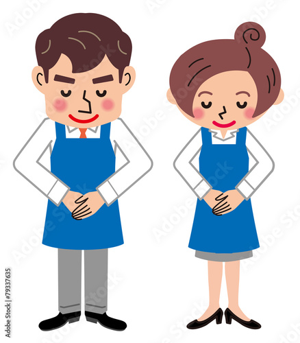 bow, bow, apology, greeting, information, apron, uniform, uniform, clerk, manager, hardware store, supermarket, convenience store, supermarket, market, eatery, fast food, cafes, coffee, store, man, woman, two persons