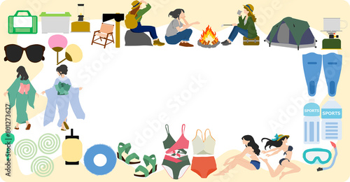 summer, midsummer, frame, illustration, camping, tent, mountain, sea, outdoors, leisure, vacation, summer getaway, vacation, beach, sand, water, balefire, bikini, relaxation, sky, travel, vacation, sun, woman, woman, swimwear, float, icon, silhouette