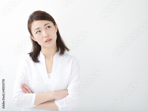 contemplate, trouble, difficulty, woman, girl, young, apprehension, disapproval, stress, frustration, adult, student, homemaker, white, white background, waist up, alone, light, refreshing, health, cosmetic, beauty, live, lifestyle, sweet, pretty, pretty, clean, japanese, asian, korean, chinese, taiwanese, annoyance, relation, bust, instability