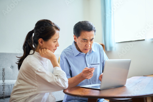 aged, couple, cyberspace, phishing, credit card, man, personal computer, notebook, card, pin, clearing, bank, deposit, account, nest egg, lifestyle, second life, pension, aged, 60's, japanese, people, waist up, two people, shopping, smile, copy space, affirmation, registry, lying, aged, payment, crime, password, security