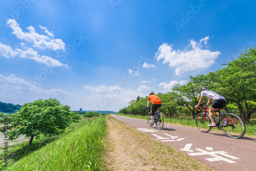 cycling, bike, bike, promenade, river, stream, bank, blue skies, green, light, sun, tokyo