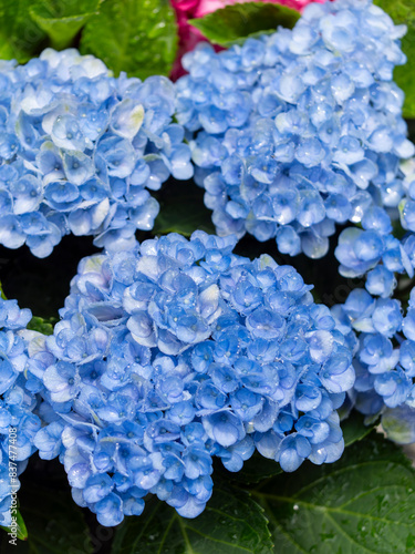 雨に濡れた青い紫陽花の花