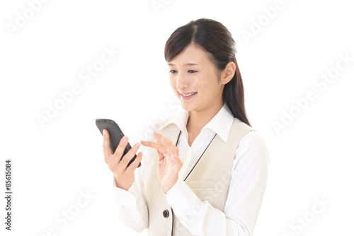 woman, people, people, business, work, working girl, smartphone, smartphone, cyberspace, mobile phone, call, operation, mobile, iphone, woman, sweet, pretty, adult, young, ol, office, corporation, corporate, work, suit, shirt, waist, expression, smile, smile, smile, fun, lively, flop, model, beauty, girl, happy, happiness, health, cosmetic, alone, japanese, asian, copy space, waist up, white background