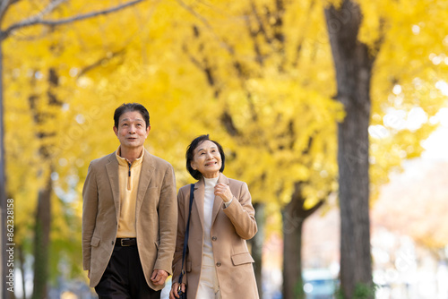 couple, people, middle-aged, aged, two people, two persons, outdoors, open air, park, fall, ginkgo, ginkgo, walk, november, december, couple