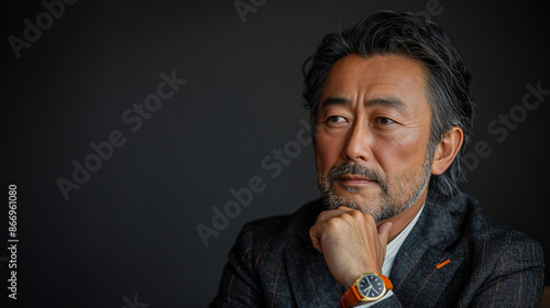man, 50's, businessman, employee, people, uncle, japanese, suit, watch, business, waist up, copy space, work, contemplate, trouble, black hair, cravat, dark, solemn, portrait, stress, asian, profile, shade, earnest, cool, cool, jacket, office, planning, aim, ambition, privies, president