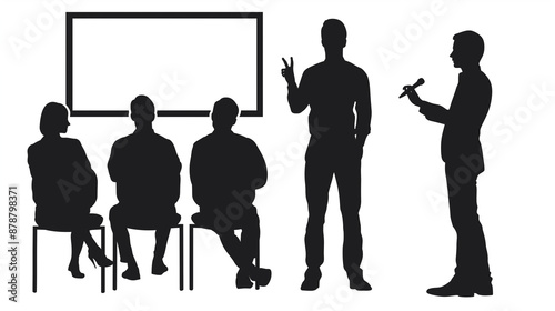 silhouette, icon, people, training, workshop, presentation, announcement, orientation, discourse, briefing, speech, business, version, discourse, conversation, training, scene, illustration, person, black, shadow, man, microphone, moderator, projector, corporate, corporation, project, mapping, monitor, tour, black-and-white, chair, seated, study, look, hear