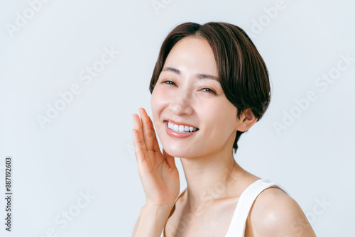 cosmetic, smile, beauty, woman, natural, skincare, middle-aged, face, este, facial, cheek, beauty, indoor, indoor, smile, hand, light, copy space, health care, pretty, white background, camisole, singlet, portrait, health, japanese, people, relax