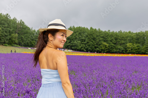 旅先の北海道ラベンダー畑に立つ女性