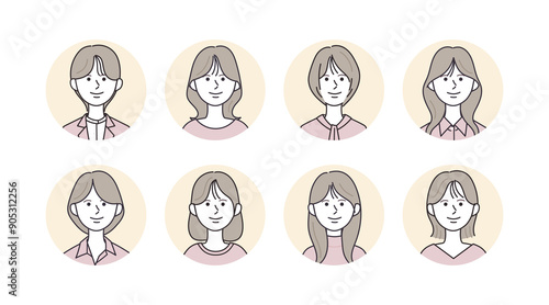 woman, icon, face, set, vector, people, illustration, avatar, sweet, pretty, positive, smile, expression, fun, pose, waist up, woman, girl, employee, adult, youth, japanese, 30s, client, voice, work, message, word of mouth, appraisal, user, advantage, point, circle, round, transparent, plural, variation, much