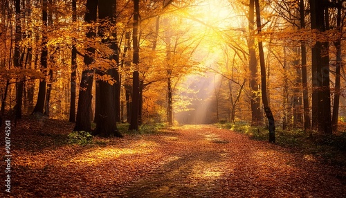 秋の公園の落ち葉が積もった道と金色の光が差し込む風景