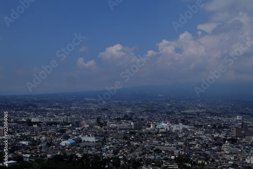 landscape, japan, nature, sky, blue skies, sunny, mountain, view, open air, route, summer, cloud, white, view, town, city, building, vision