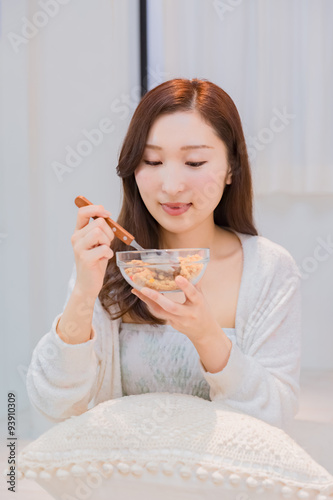 granola, cereal, breakfast, woman, smile, lifestyle, food, meal, people, japanese, spoon, meal, long hair, health, health care, health food, indoor, pajama, morning