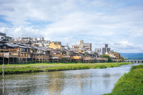 曇りの鴨川沿いに建ち並ぶ川床の景色
