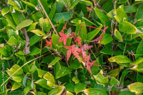 水滴をまとって輝くきれいに色づいた小さなカエデの紅葉