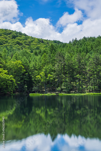 日本 長野県茅野市にある御射鹿池 水面に鏡面反射する新緑のカラマツの木々