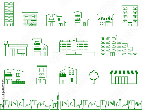 town, town, house, house, convenience store, coffee, eatery, condo, school, schoolhouse, city, city centre, building, skyline, bike, building, illustration, architecture, home, tower, residential area, japan, icon, landmark, wood, green, green, vector