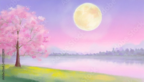 春をイメージした満月の背景イラスト