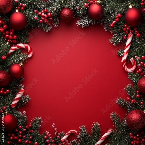 red, christmas, fir, vacation, decoration, celebration, winter, background, frame, ornament, card, merry, design, season, greeting, structure, border, happy, copy space, new, age, layout, table, flat, overhead, green, gift, postcard, banner, concept, gift, december, branch, ball, white, event, gold, eve, light, wood
