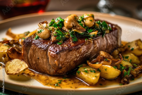 food, dish, plate, cookery, delicious, closeup, receipe, ai, meat, dinner, steak, grilled, sauce, eatery, potato