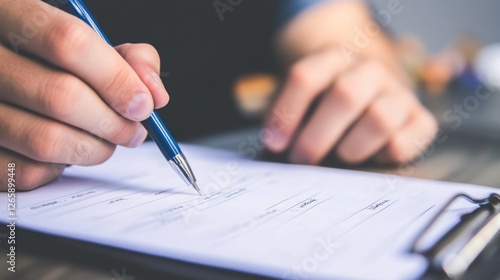 Filling out a form with a pen, business or education concept