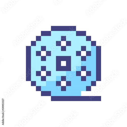Film reel pixelated RGB color ui icon. Motion pictures. Recorded strip. Simplistic filled 8bit graphic element. Retro style design for arcade, video game art. Editable vector isolated image