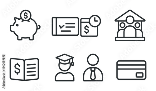 finance, banking, linear, outline, icon, set, baby pig, bank, checkbook, school, graduate, professional, credit, card, learning, saving, investment, student, budgeting, transaction, loan, degree, scholarship, business